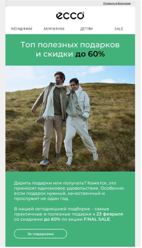 Предлагать приобрести что-то в подарок себе или близким — не must have. А вот сделать coming out подходящих по тематике товаров бренда, рассказать о них в необычном ключе, очень даже на 5+ идея. Спойлер: те, кто хочет купить подарок к празднику, и так это сделают, без ваших СТА. Поэтому лучше заинтересуйте их ассортиментом и дайте скидку. Аудитория уже привыкла получать discount.