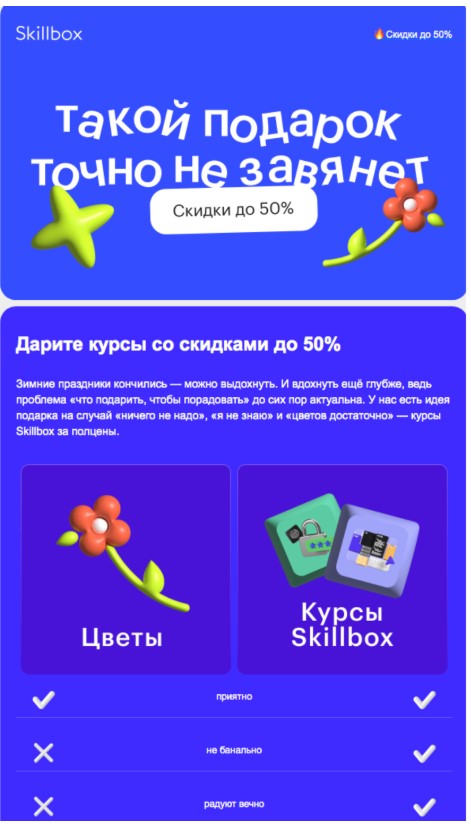 Skillbox также не называет праздника, хотя использует цветы как универсальный код для намека