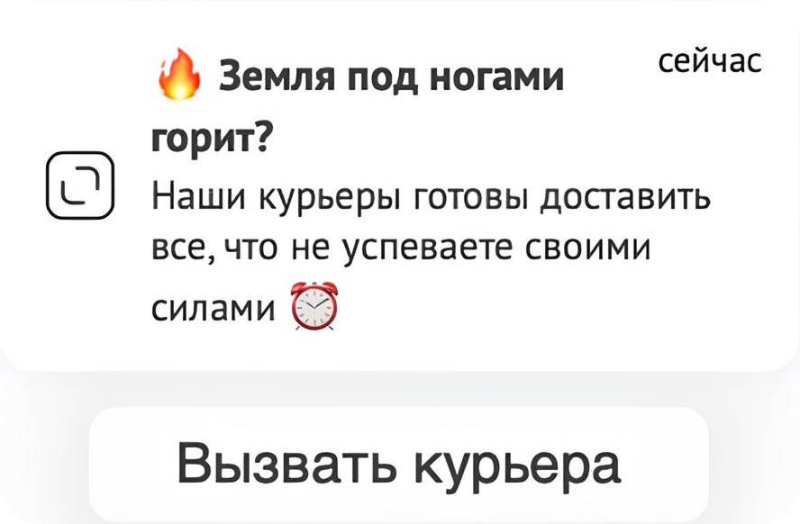 Фраза мгновенно вызывает внимание и чувство срочности. Сообщение решает боль бизнес-аудитории: нехватка времени и ресурсов. CTA «Вызвать курьера» усиливает мотивацию. Бренд позиционирует себя как партнера, который помогает в пиковые дни.