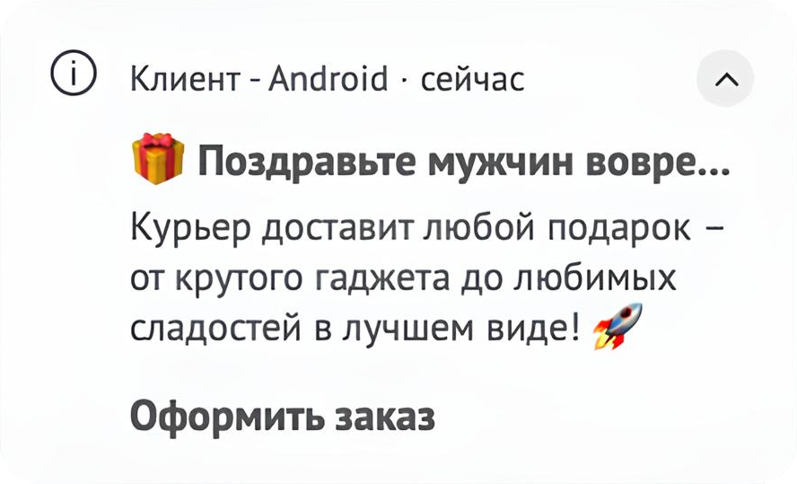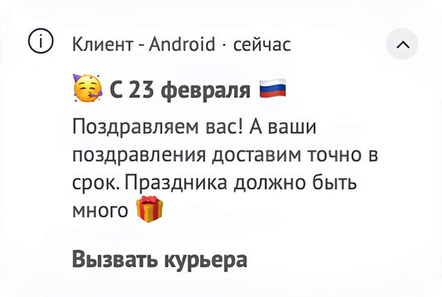 «Для одного из клиентов агентства мы разработали цепочку коммуникаций на 23 февраля с оглядкой на бюджет и гиперперсонализированную подачу. Для реализации задачи выбрали мобильные пуши. Они были отправлены 23 февраля и разделены по целевым группам: