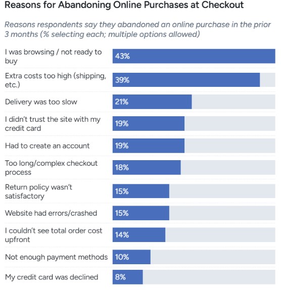 По данным из того же исследования, 43% пользователей и не планировали покупку вовсе. Они просто смотрели товары. 39% смутили дополнительные расходы, которые были неизвестны сразу. 21% отказался от заказа из-за длительной доставки, а 18% сбил с толку слишком сложный процесс оформления заказа. Полный рейтинг причин Baymard Institute приведен ниже.