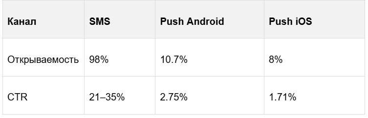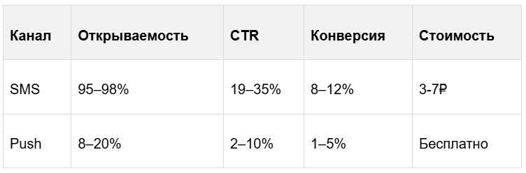 Выбор канала — key point для ROI. SMS открывают в 95–98% случаев, пуши — 8–20%. При этом конверсия SMS 8–12%, а у пуша до 10% CTR. Когда какой выбрать?